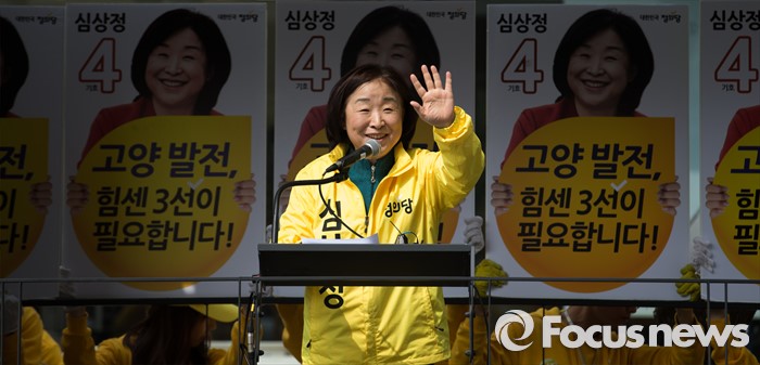 (고양=포커스뉴스) 제20대 국회의원 선거를 하루 앞둔 12일 오후 심상정 정의당 고양갑 후보가 경기 고양시 롯데마트 화정점 앞에서 유권자들에게 인사하고 있다.
