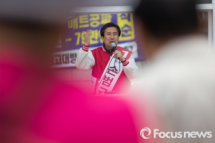 (고양=포커스뉴스) 제20대 국회의원 선거를 하루 앞둔 12일 오후 경기도 고양시 화정역 앞에서 손범규 새누리당 고양갑 후보가 유권자들에게 지지호소 하고 있다.