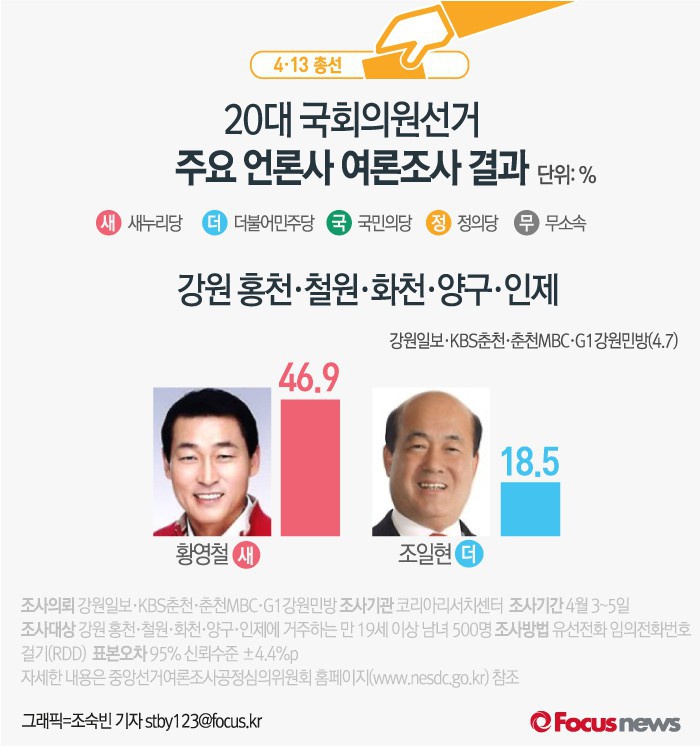 홍천·철원·화천·양구·인제 지역구를 따로따로 조사했을 때도 황영철 후보가 5개 지역 지지율에서 모두 조일현 후보를 앞섰다.