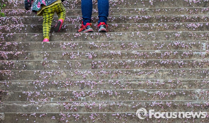 (부산=포커스뉴스) 부산 사상구의 한 아파트에서 할머니 손을 잡은 어린이가 꽃잎이 떨어져있는 계단을 아장아장 걸어가고 있다.