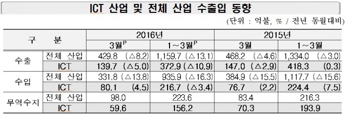 ICT 수입은 해외 생산거점에서 휴대폰 부분품 수입이 증가하면서 80억1000만달러를 기록하면서 전년 동월대비 4.5% 증가했다. ICT 수지는 반도체, 휴대폰, 디스플레이 등 주력품목의 흑자로 59억6000만달러 흑자를 기록해 전체 수지 흑자(98억달러)을 견인했다.3월 ICT 수출입 동향.<표제공=미래부>