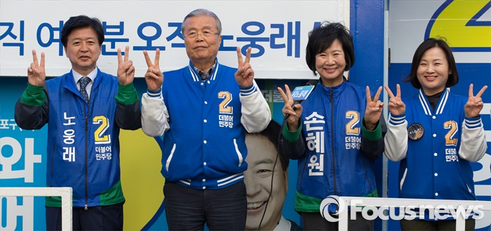 (서울=포커스뉴스) 2016 제20대 국회의원선거를 하루 앞둔 12일 오후 서울 마포구 공덕역 인근 경의선숲길공원에서 노웅래 더불어민주당 마포갑 후보, 김종인 더불어민주당 비대위 대표 겸 선대위원장, 손혜원 마포을 후보가 유권자들에게 지지를 호소하고 있다.