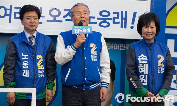(서울=포커스뉴스) 2016 제20대 국회의원선거를 하루 앞둔 12일 오후 서울 마포구 공덕역 인근 경의선숲길공원에서 노웅래 더불어민주당 마포갑 후보, 김종인 더불어민주당 비대위 대표 겸 선대위원장, 손혜원 마포을 후보가 유권자들에게 지지를 호소하고 있다.