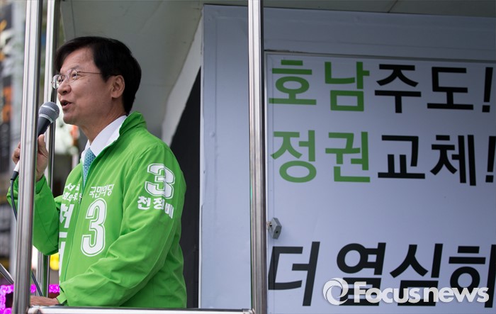 (광주=포커스뉴스) 4.13총선을 하루 앞둔 12일 오후 광주 서구 화정동 염주사거리에서 천정배 국민의당 광주 서구을 후보가 선거유세를 하고 있다.