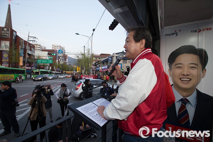 (서울=포커스뉴스) 12일 오후 서울 노원구 GS수퍼마켓 상계점 앞에서 김무성 새누리당 대표가 이준석 새누리당 노원병 후보자 지원 유세를 하고 있다.