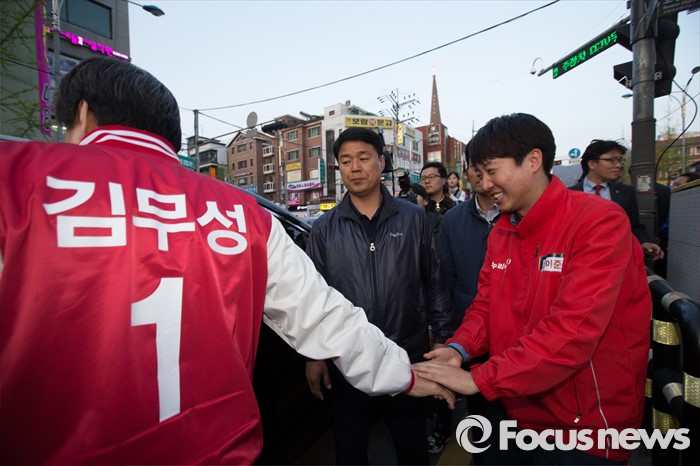 (서울=포커스뉴스) 12일 오후 서울 노원구 GS수퍼마켓 상계점 앞에서 김무성 새누리당 대표가 이준석 새누리당 노원병 후보자 지원 유세를 하고 있다.