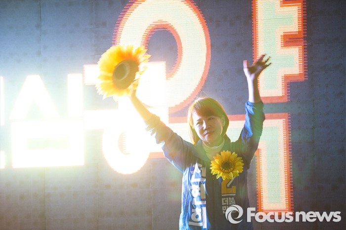 (서울=포커스뉴스) 공식 선거운동이 끝나는 12일 오후 서울 강남구 수서역 앞에서 전현희 더불어민주당 후보가 퇴근길 시민들을 향해 유세를 하고 있다.