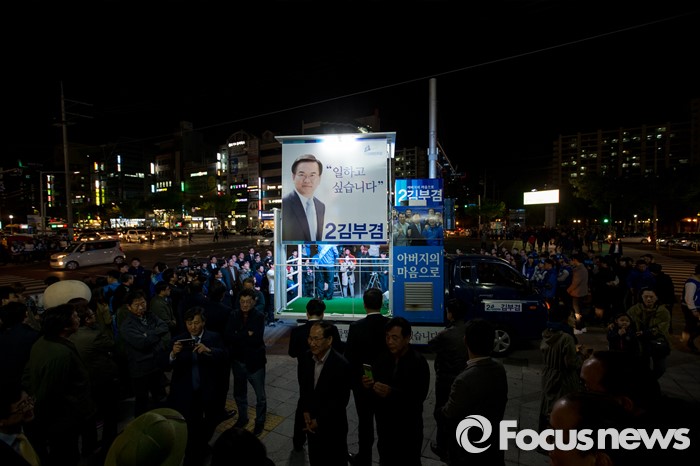 (대구=포커스뉴스) 김부겸 더불어민주당 수성구갑 후보가 12일 오후 대구광역시 수성구 신매네거리에서 유세를하며 유권자들에게 한 표를 호소 하고 있다.