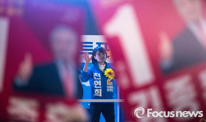 (서울=포커스뉴스) 공식 선거운동이 끝나는 12일 오후 서울 강남구 수서역 앞에서 전현희 더불어민주당 후보가 퇴근길 시민들을 향해 유세를 하고 있다.