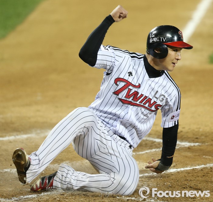 (서울=포커스뉴스) 12일 서울 잠실구장에서 열린 2016 프로야구 롯데-LG 경기 6회말 1사 1루에서 LG 1루주자 오지환이 정주현의 2루타때 홈인하고 있다.