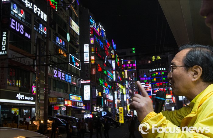 (창원=포커스뉴스) 4.13총선 선거운동 마지막날인 12일 오후 경남 창원시 상남분수광장에서 노회찬 정의당 창원 성산구 후보가 유권자들의 지지를 호소하고 있다.