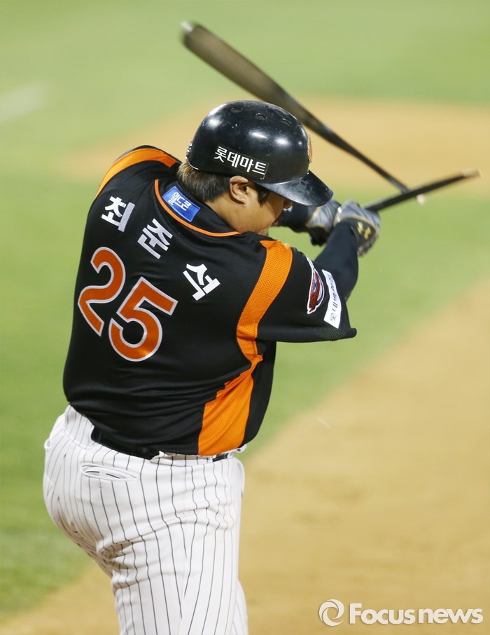 (서울=포커스뉴스) 12일 서울 잠실구장에서 열린 2016 프로야구 롯데-LG 경기 7회초 2사 2루에서 롯데 최준석이 중견수앞 안타를 치고 있다.