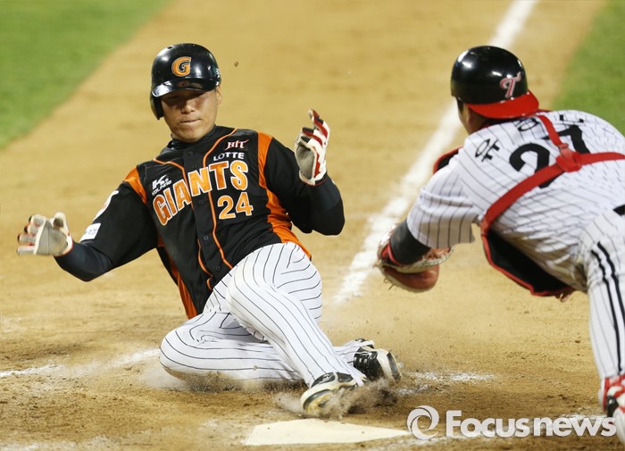 (서울=포커스뉴스) 12일 서울 잠실구장에서 열린 2016 프로야구 롯데-LG 경기 7회초 2사 2루에서 롯데 손아섭의 좌익수앞 안타때 2루주자 김문호가 홈인하고 있다.