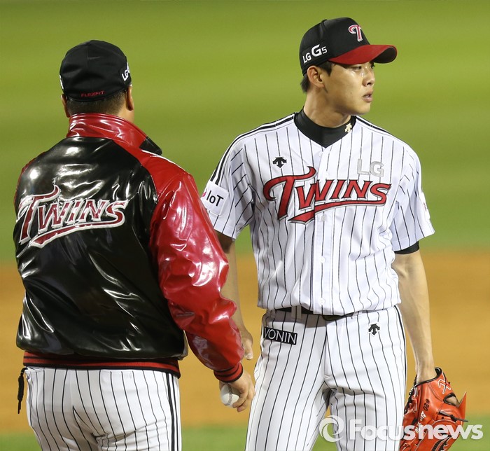 (서울=포커스뉴스) 12일 서울 잠실구장에서 열린 2016 프로야구 롯데-LG 경기 9회초 3점차 승리를 지키러 나왔던 LG 투수 임정우가 2실점 후 동점 주자를 두고 강판되고 있다.