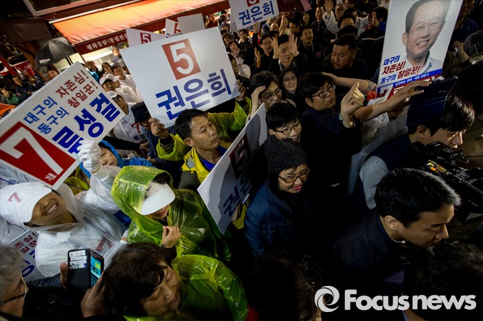 (대구=포커스뉴스) 12일 오후 대구광역시 동구 평화시장 닭똥집골목에서 권은희 무소속 대구 북구갑 후보, 유승민 무소속 대구 동구을 후보, 유성걸 대구 동구갑 후보 지지자들이 후보들을 보며 환호 하고 있다.