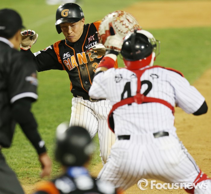 (서울=포커스뉴스) 12일 서울 잠실구장에서 열린 2016 프로야구 롯데-LG 경기 9회 1사 1,2루에서 롯데 황재균의 내야안타때 2루주자 손아섭이 홈으로 뛰어들고 있다.
