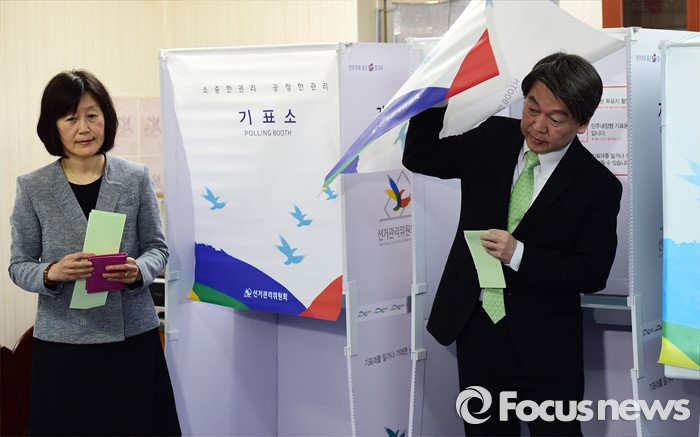 (서울=포커스뉴스) 안철수 국민의당 상임공동대표가 제20대 국회의원선거날인 13일 서울 노원구 상계1동 제7투표소에서 부인 김미경 씨와 투표를 하고 있다.