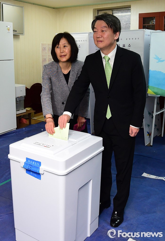(서울=포커스뉴스) 안철수 국민의당 상임공동대표가 제20대 국회의원선거날인 13일 서울 노원구 상계1동 제7투표소에서 부인 김미경 씨와 투표를 하고 있다.