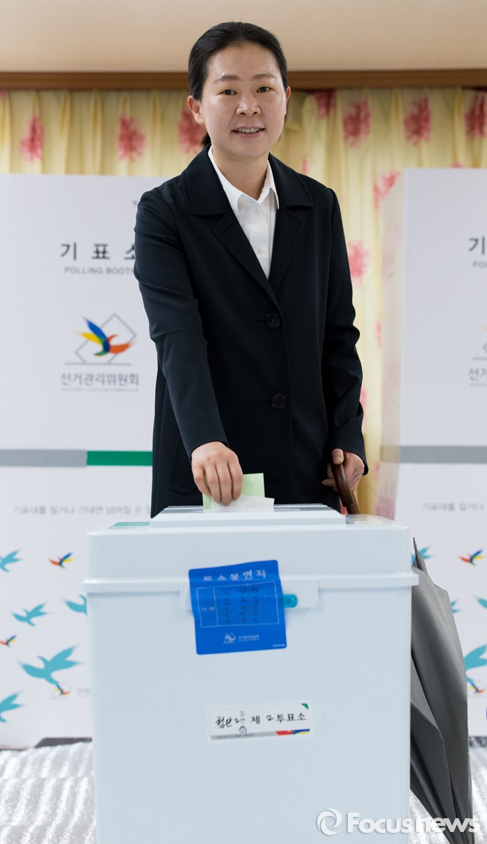 (광주=포커스뉴스) 제20대 국회의원 선거일인 13일 오전 광주 광산구 첨단라인1차아파트 경로당에서 권은희 국민의당 광주 광산구을 후보가 투표를 하고 있다.