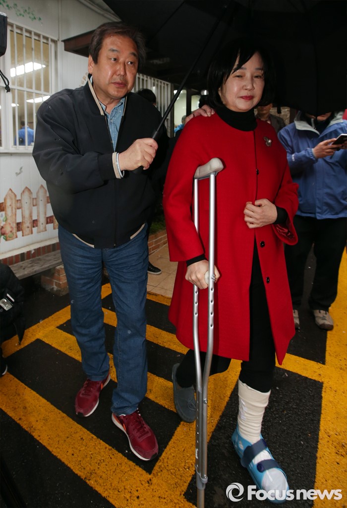 (부산=포커스뉴스) 제20대 국회의원선거일인 13일 오전 부산 영도구 동삼1동 제6투표소에서 김무성 새누리당 대표와 부인 최양옥 씨가 투표를 마친 후 차량으로 향하고 있다.