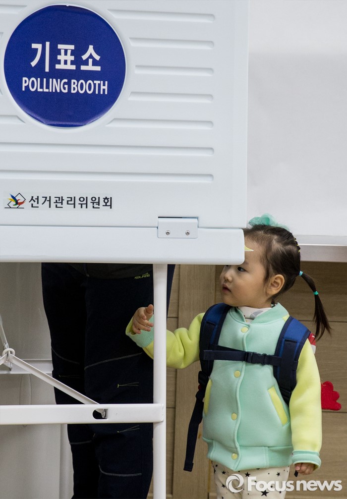(부산=포커스뉴스) 제20대 국회의원선거일인 13일 오전 부산 영도구 동삼1동 제6투표소에서 한 어린이가 아빠의 투표를 기다리고 있다.
