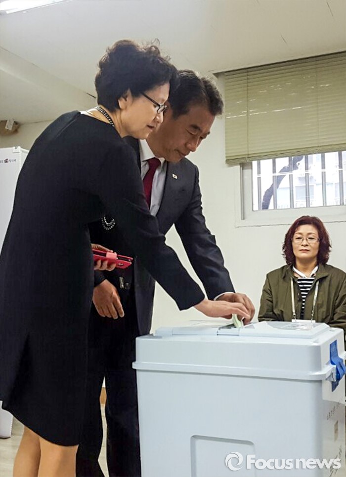 (대구=포커스뉴스) 제20대 국회의원선거날인 13일 오전 대구 동구 효목동에 마련된 투표소에서 정종섭 새누리당 동구갑 후보가 투표를 하고 있다.