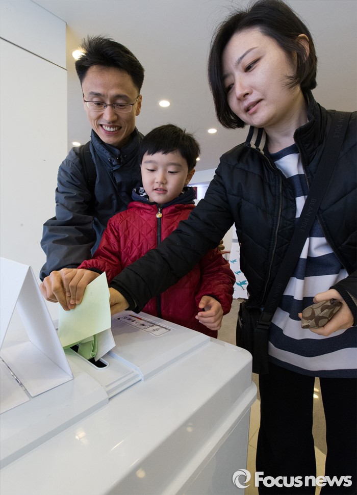 (서울=포커스뉴스) 제20대 국회의원선거일인 13일 오전 서울 광진구 능동 제3투표소에서 한 가족이 함께 투표하고 있다.
