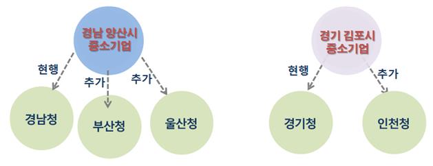 예를 들어 경남 양산시의 중소·중견기업은 관할 경남지방청 외에 거리상 가까운 울산지방청이나 부산지방청을 이용할 수 있으며, 경기도 김포시에 있는 중소·중견기업은 경기지방청 외에 인근의 인천지방청에 방문해 행정서비스를 제공받을 수 있다.