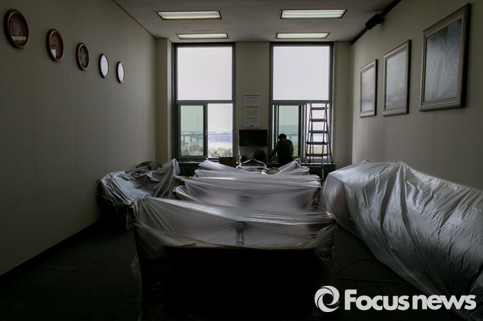 (서울=포커스뉴스) 20대 총선 투표일인 13일 오후 서울 여의도 국회 본청에서 업체 관계자들이 창문교체 작업을 하고 있다.