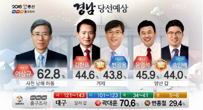 (서울=포커스뉴스) 13일 오후 6시 KBS·MBC·SBS 지상파 방송3사가 공동조사, 발표한 4·13 총선 출구조사 결과에 따르면 경남 양산갑 지역구에서는 윤영석 새누리당 후보가 45.9%로 송인배 더불어민주당 후보(44.0%)와 경합 중으로 나타났다.<사진출처=KBS 출구방송 화면캡쳐>