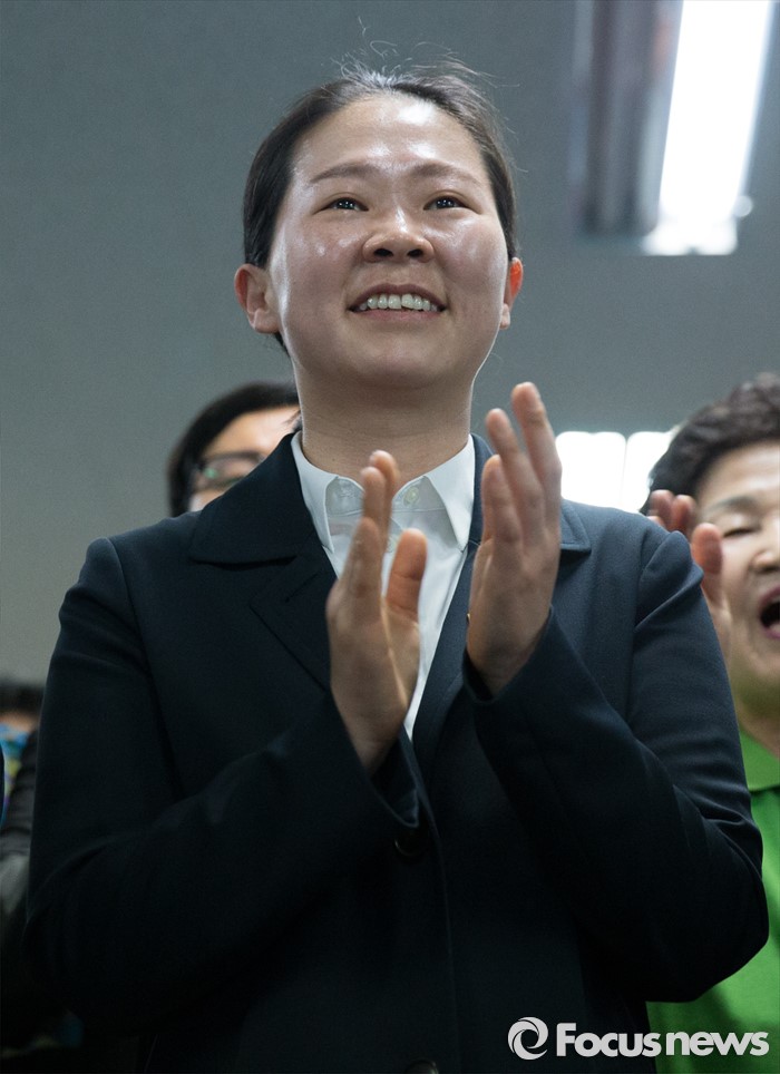 (광주=포커스뉴스) 제20대 국회의원 선거일인 13일 오후 광주 서구 국민의당 광주광역시당에서 권은희 국민의당 광산구을 후보가 출구조사 결과를 보고 박수 치고 있다.