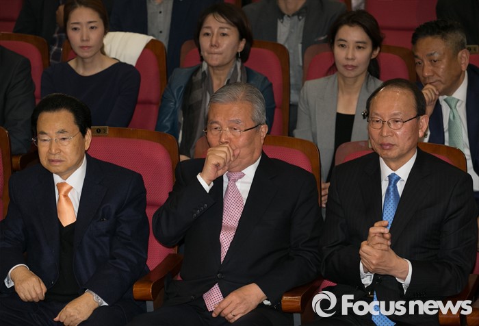 (서울=포커스뉴스) 20대 총선 투표일인 13일 오후 서울 여의도 국회 의원회관 대회의실에 마련된 더불어민주당 개표상황실에서 김종인 비대위 대표 겸 선대위원장이 출구조사 및 개표방송을 시청하던 중 기침하고 있다. 왼쪽부터 송현섭 부위원장, 김 대표, 최운열 국민경제상황실장.