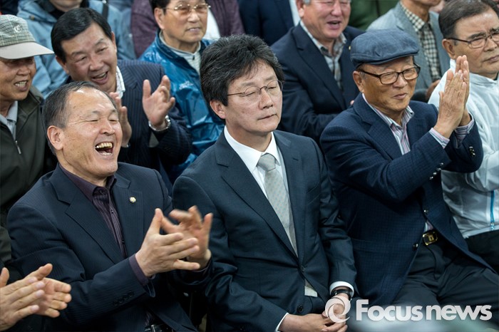 제일 앞 자리에 앉은 유 후보는 중간중간 뒤를 돌아보며 눈이 마주치는 지지자들과 인사를 나누기도 했다.