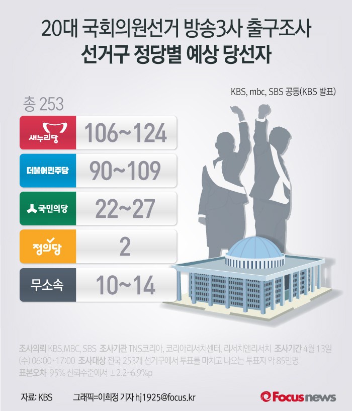 (서울=포커스뉴스) KBS발표 20대 국회의원선거 방송3사 공동 출구조사 선거구 정당별 예상 당선자 비교.