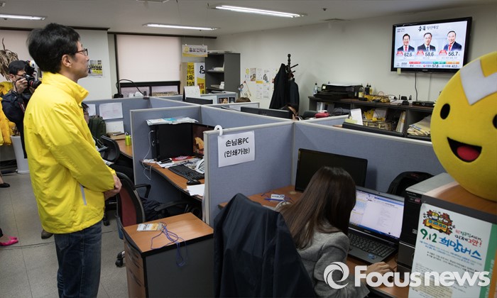 (서울=포커스뉴스) 2016 제20대 국회의원선거날인 13일 오후 서울 영등포구 정의당사에서 천호선 공동선거대책위원장을 비롯한 관계자들이 방송사들의 출구조사 결과를 지켜보고 있다.