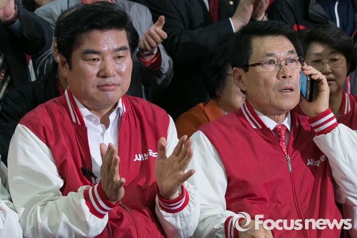 (서울=포커스뉴스) 제20대 국회의원 선거날인 13일 오후 서울 여의도 새누리당사에서 원유철(왼쪽) 원내대표가 방송 3사의 출구조사를 시청하며 박수치는 동안, 이군현 공동총괄본부장이 전화통화를 하고 있다.
