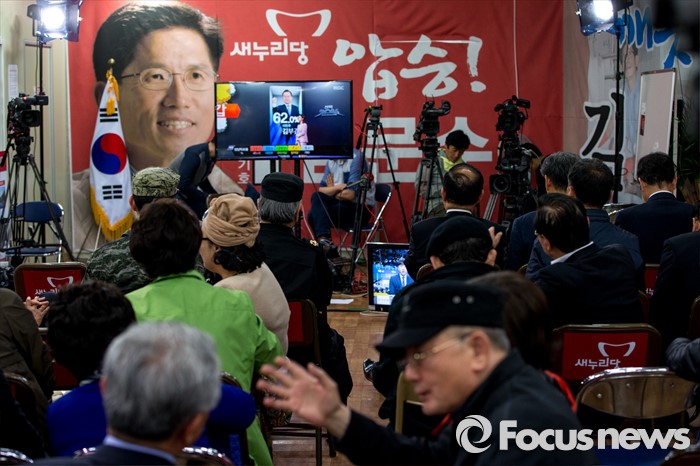 (대구=포커스뉴스) 제20대 국회의원선거 출구조사 결과 대구 수성갑 새누리당 김문수 후보가 38퍼센트에 그치며 당선이 불투명한 13일 오후 대구 수성구 김 후보 선거사무소에 지지자들이 개표방송을 보고 있다.