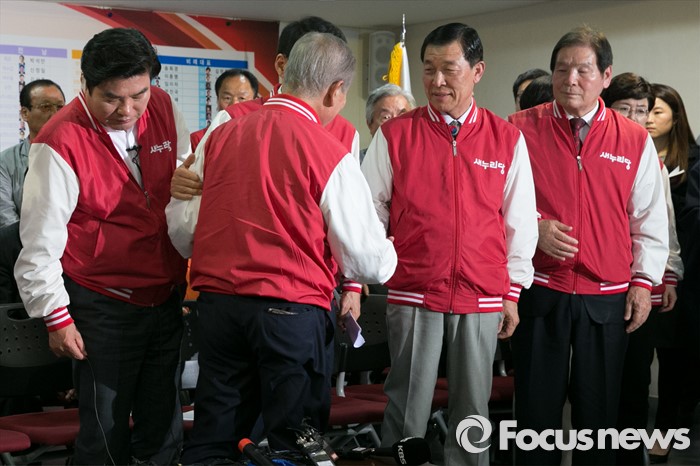 (서울=포커스뉴스) 제20대 국회의원 선거날인 13일 오후 서울 여의도 새누리당사에서 강봉균(앞줄 뒷모습) 공동선대위원장이 방송 3사의 출구조사 시청 중 자리를 뜨자, 원유철(왼쪽) 원내대표 등 지도부가 배웅하고 있다.