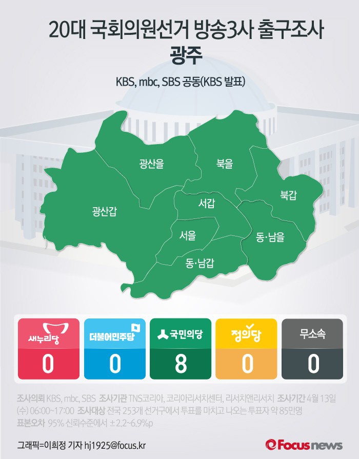 KBS·mbc·SBS 지상파 방송 3사 공동 출구조사에서 국민의당이 더불어민주당에 광주 전 지역에서 '8:0' 으로 우세를 예측했다.