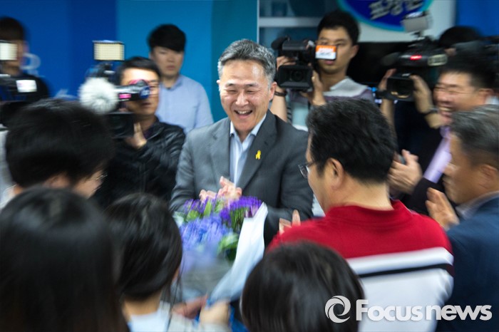 (용인=포커스뉴스) 제20대 국회의원 선거날인 13일 오후 경기도 용인시 기흥에 위치한 선거사무실에서 표창원 더불어민주당 용인정 후보가 '당선유력' 이라는 방송사 개표 상황을 확인하고 지지자들의 축하를 받고 있다.