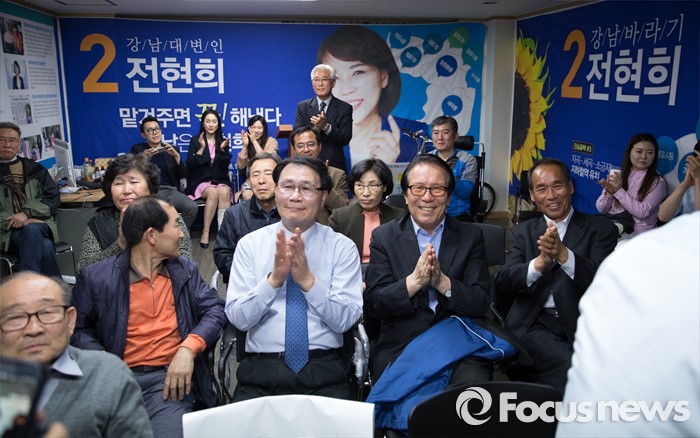 (서울=포커스뉴스) 2016 제20대 국회의원선거날인 13일 오후 서울 강남구 로즈데일빌딩에 위치한 전현희 더불어민주당 강남을 후보 선거사무소에서 지지자들이 개표장에서 들려오는 소식에 기뻐하고 있다.