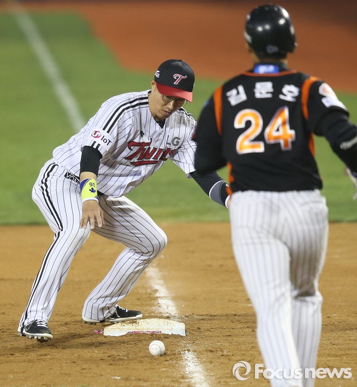 (서울=포커스뉴스) 13일 서울 잠실구장에서 열린 2016 프로야구 롯데-LG 경기 7회초 2사 2루에서 롯데 김문호의 투수앞 땅볼때 LG 1루수 정성훈이 투수 진해수의 악송구를 놓친후 다시 잡고 있다.