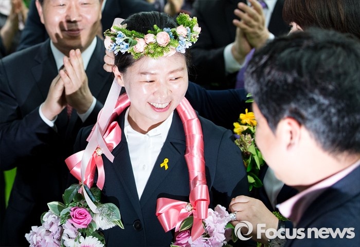 (광주=포커스뉴스) 권은희 국민의당 광주 광산구을 후보가 13일 오후 광주 광산구 수완동 선거사무실에서 당선이 유력해지자 지지자들과 환호하고 있다.