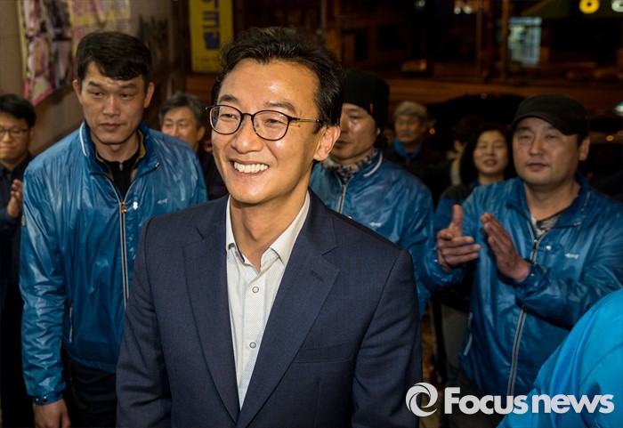 (부산=포커스뉴스) 전재수 더불어민주당 부산 북구강서구갑 후보가 13일 오후 부산 북구 선거사무소에서 당선이 확실시되자 지지자들과 함께 미소짓고 있다.