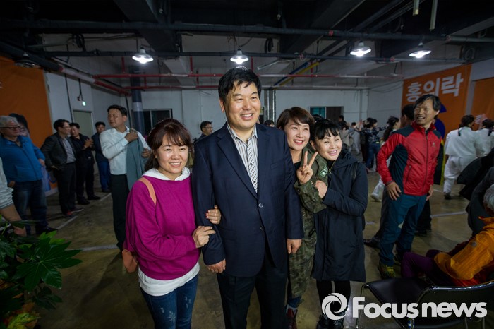 (대구=포커스뉴스) 제20대 국회의원선거 대구 북구을 선거구에서 당선이 확실시 된 무소속 홍의락 후보가 13일 오후 대구 북구 선거사무소에서 지지자들과 사진촬영을 하고 있다.