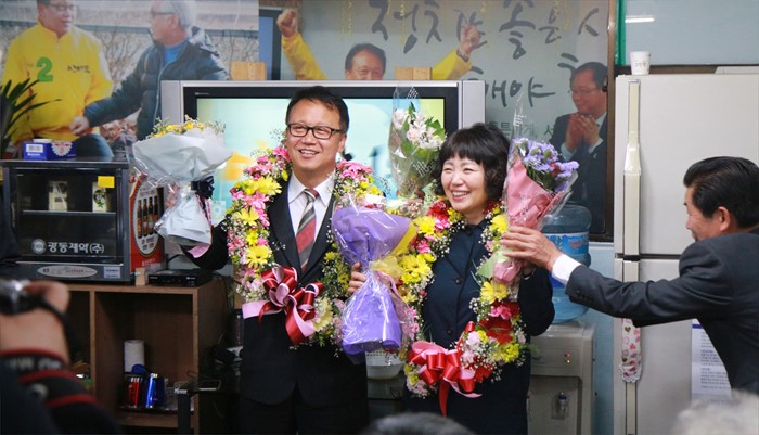 | △ 당선 확실, 기뻐하는 민병두 후보 |