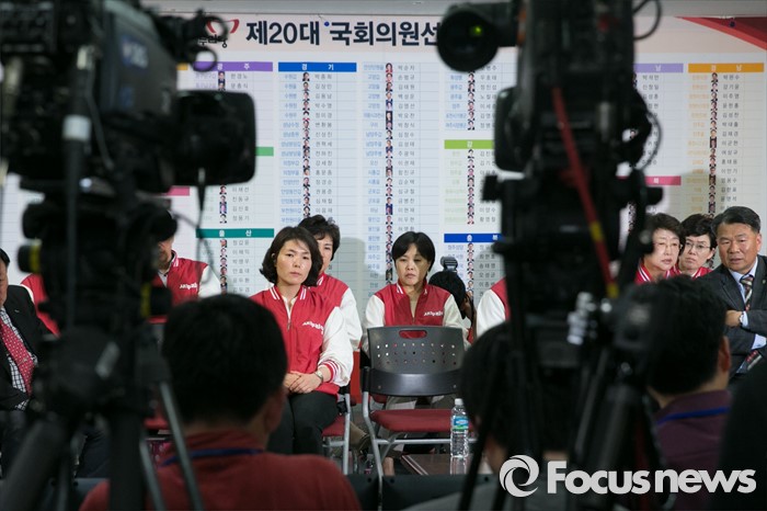 (서울=포커스뉴스) 제20대 국회의원 선거날인 13일 오후 서울 여의도 새누리당사에서 비례대표 후보들과 당직자들이 심각한 표정으로 개표방송을 시청하고 있다.
