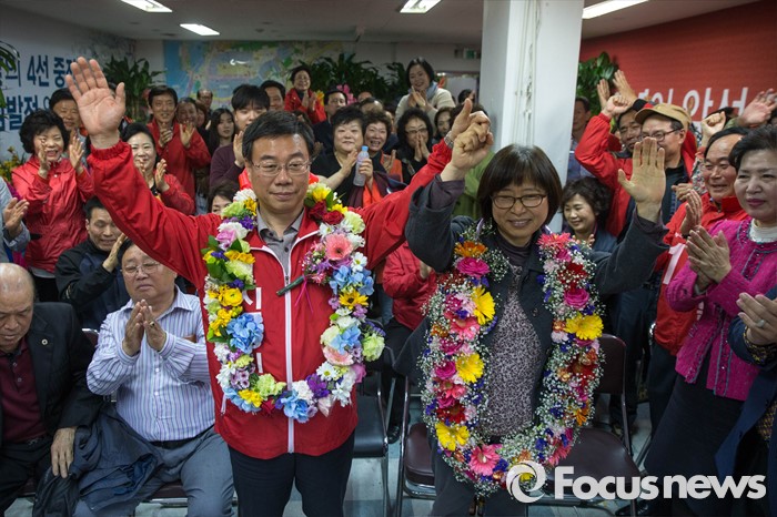 (성남=포커스뉴스) 제20대 국회의원 선거날인 13일 오후 경기도 성남 중원구에 위치한 선거사무실에서 신상진 새누리당 후보가 '당선확실' 이라는 방송사 개표 상황을 확인하고 지지자들의 축하를 받고 있다.