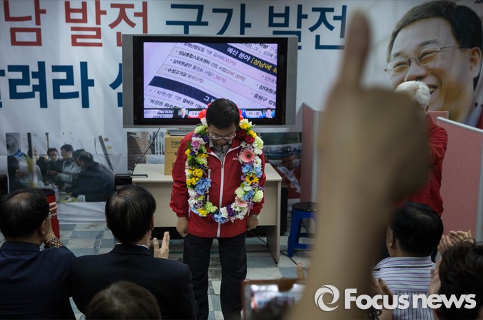 (성남=포커스뉴스) 제20대 국회의원 선거날인 13일 오후 경기도 성남 중원구에 위치한 선거사무실에서 신상진 새누리당 후보가 '당선확실' 이라는 방송사 개표 상황을 확인하고 지지자들의 축하를 받고 있다.