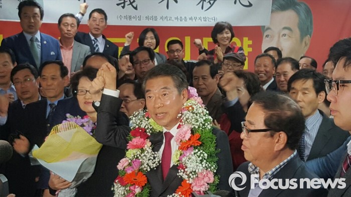 (서울=포커스뉴스) 제20대 국회의원선거일인 13일 정종섭 새누리당 대구 동구갑 후보가 당선이 확실시 되자 자신의 사무소에서 세리머니를 하고 있다. <사진제공= 정종섭 후보 선거사무소>